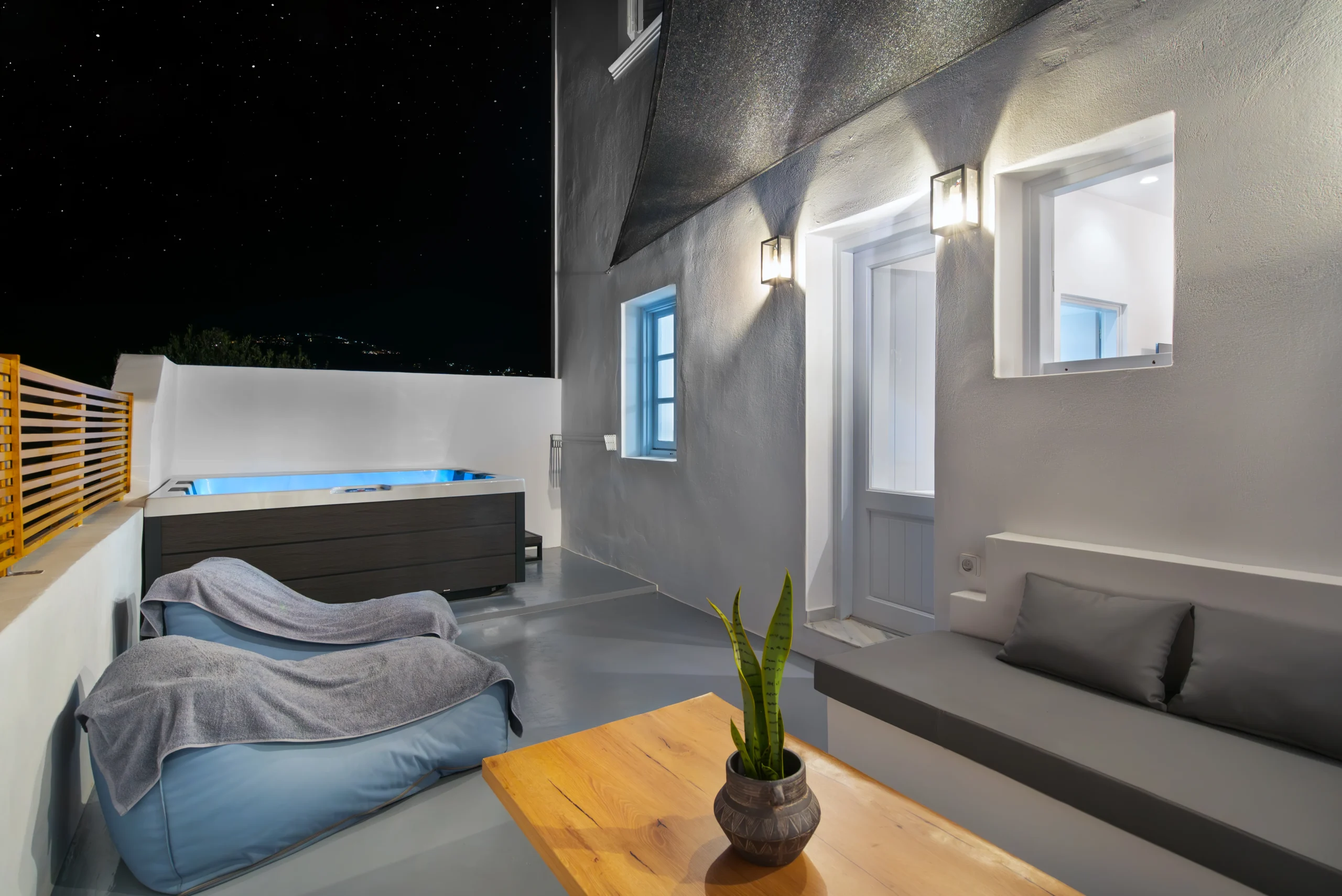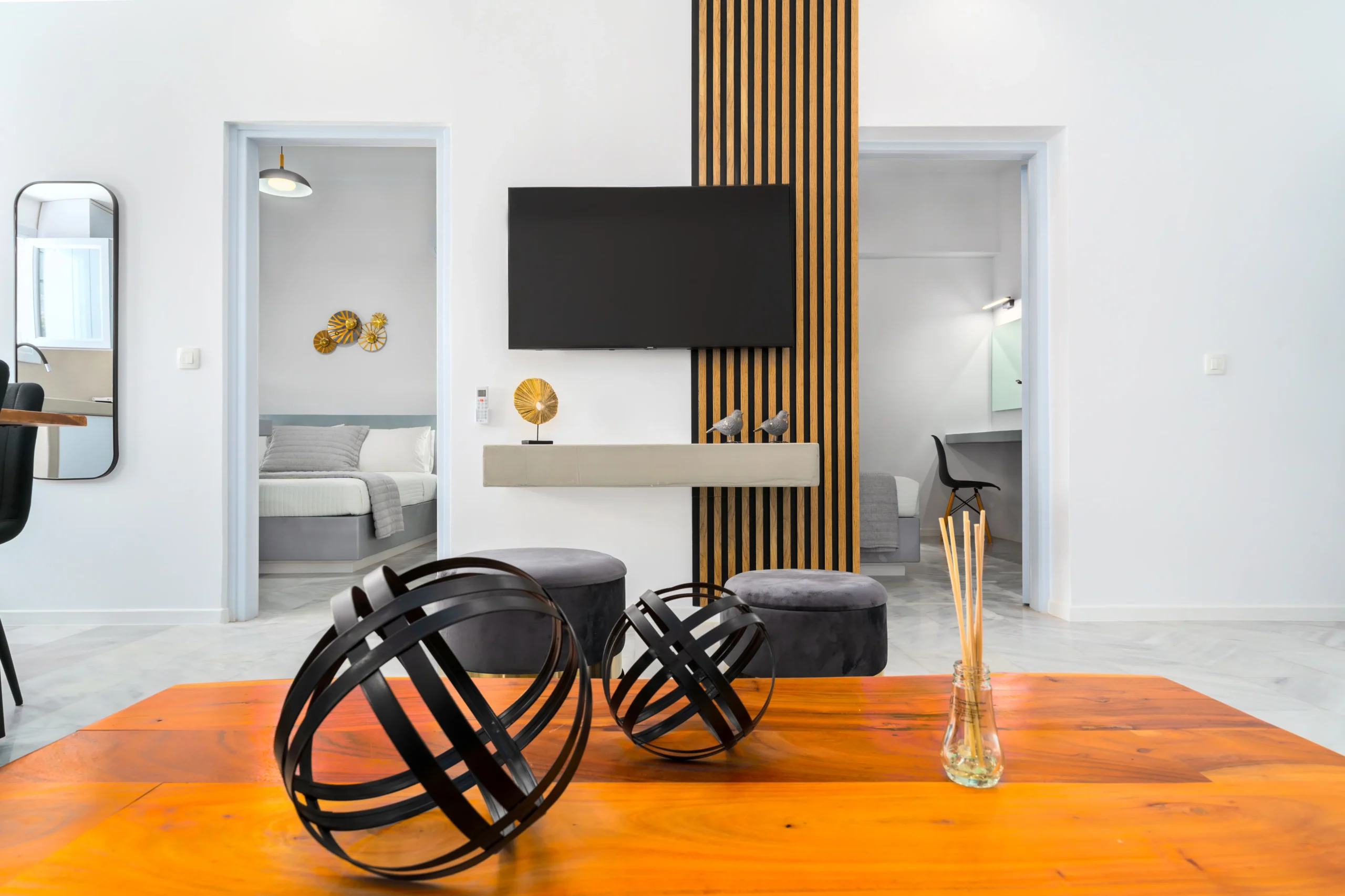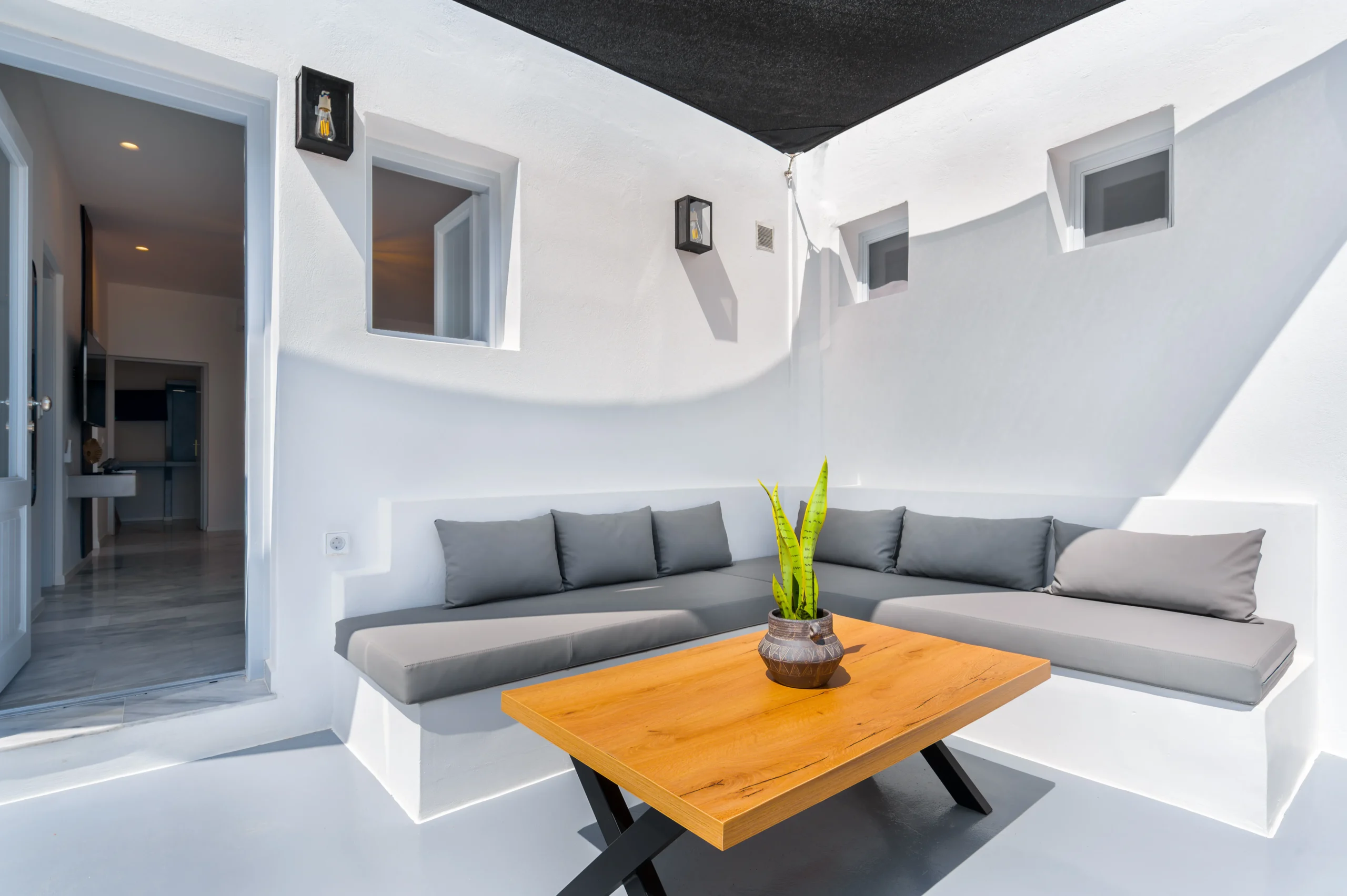 Our Superior Suite (100 m²) offers a generous living space ideal for families or two couples, or groups of friends seeking both comfort and privacy in Santorini.